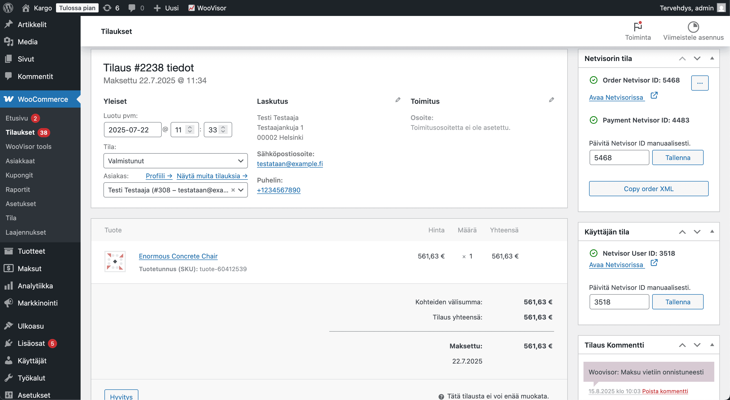 Kun WooVisor siirtää tilaukset Netvisoriin myyntitilauksiksi, voit hoitaa tilausten muutokset, laskutuksen ja jälkitoimitukset yhden kirjautumisen taktiikalla.