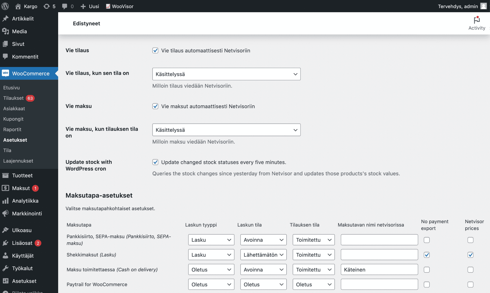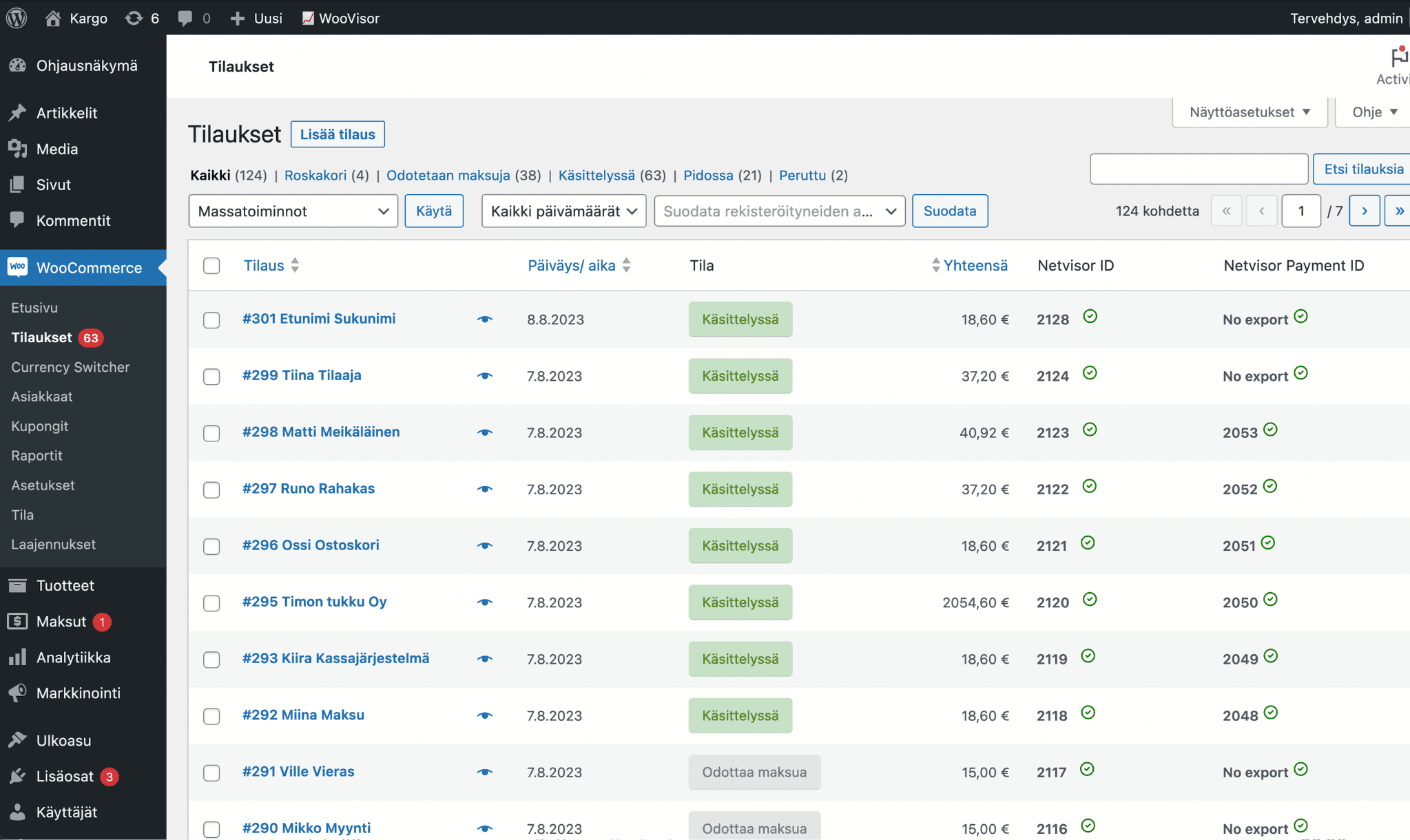 WooVisor vie tilaukset, maksut, tuotteet ja asiakkaat verkkokaupastasi Netvisoriin, varastosaldot puolestaan Netvisorista kauppaan.